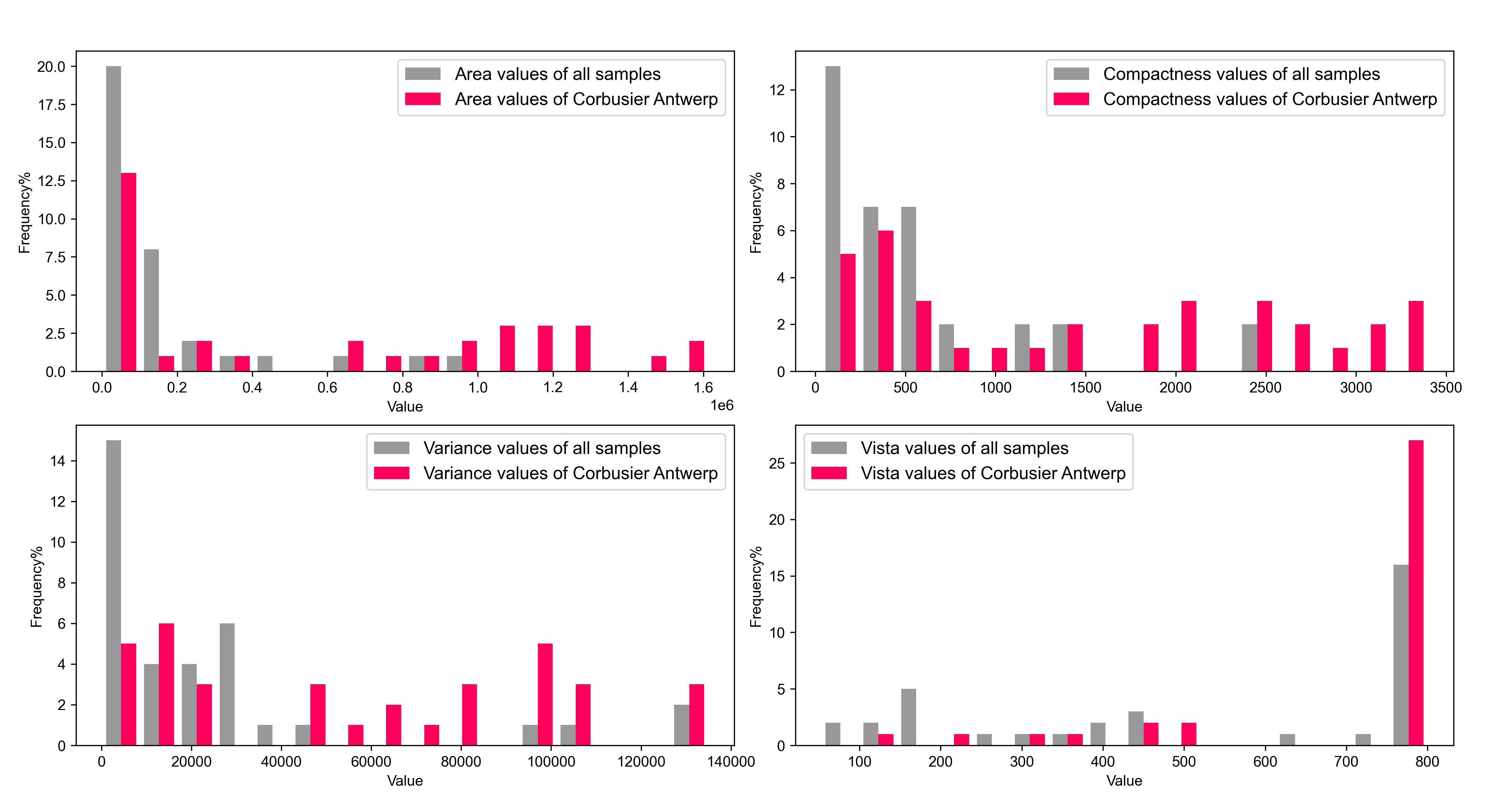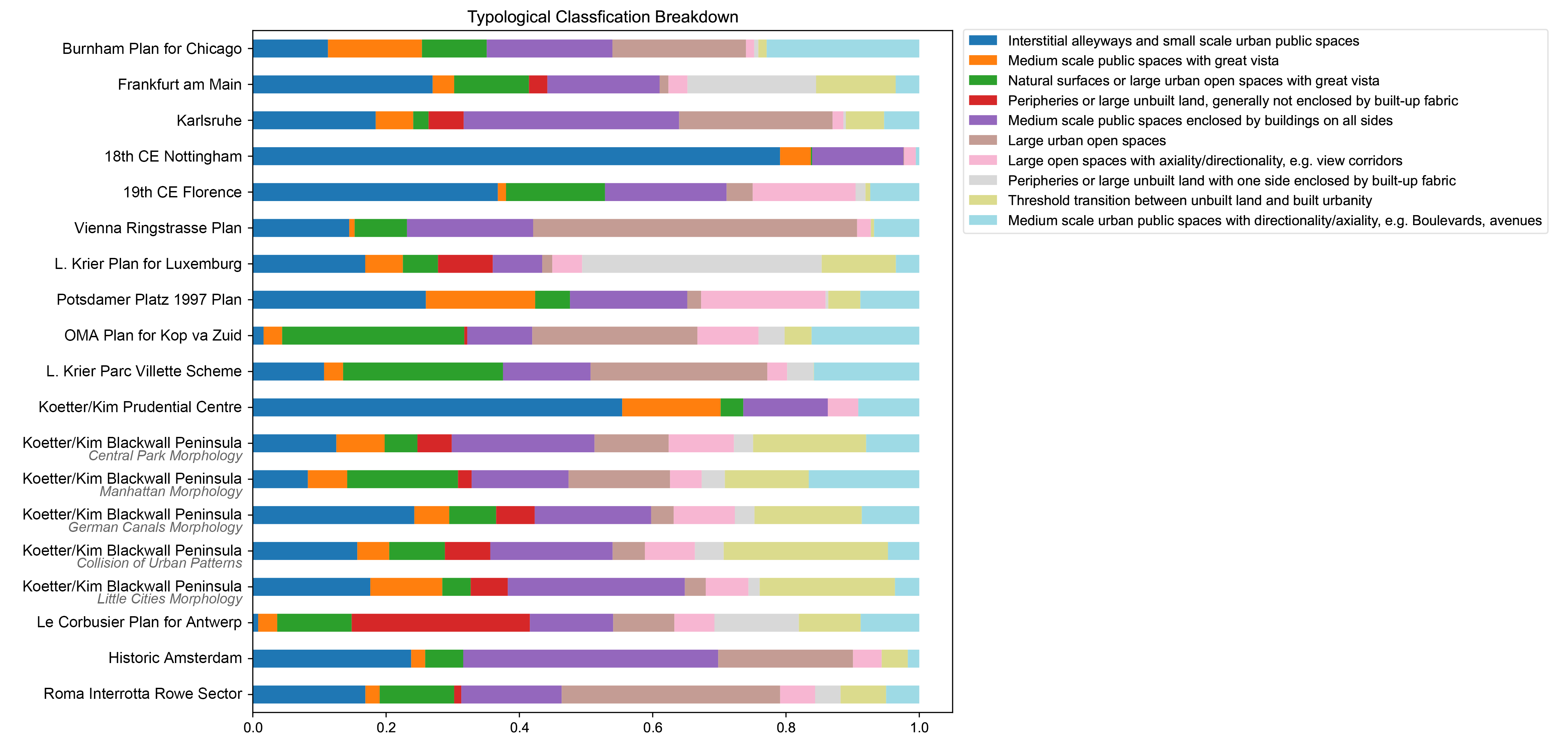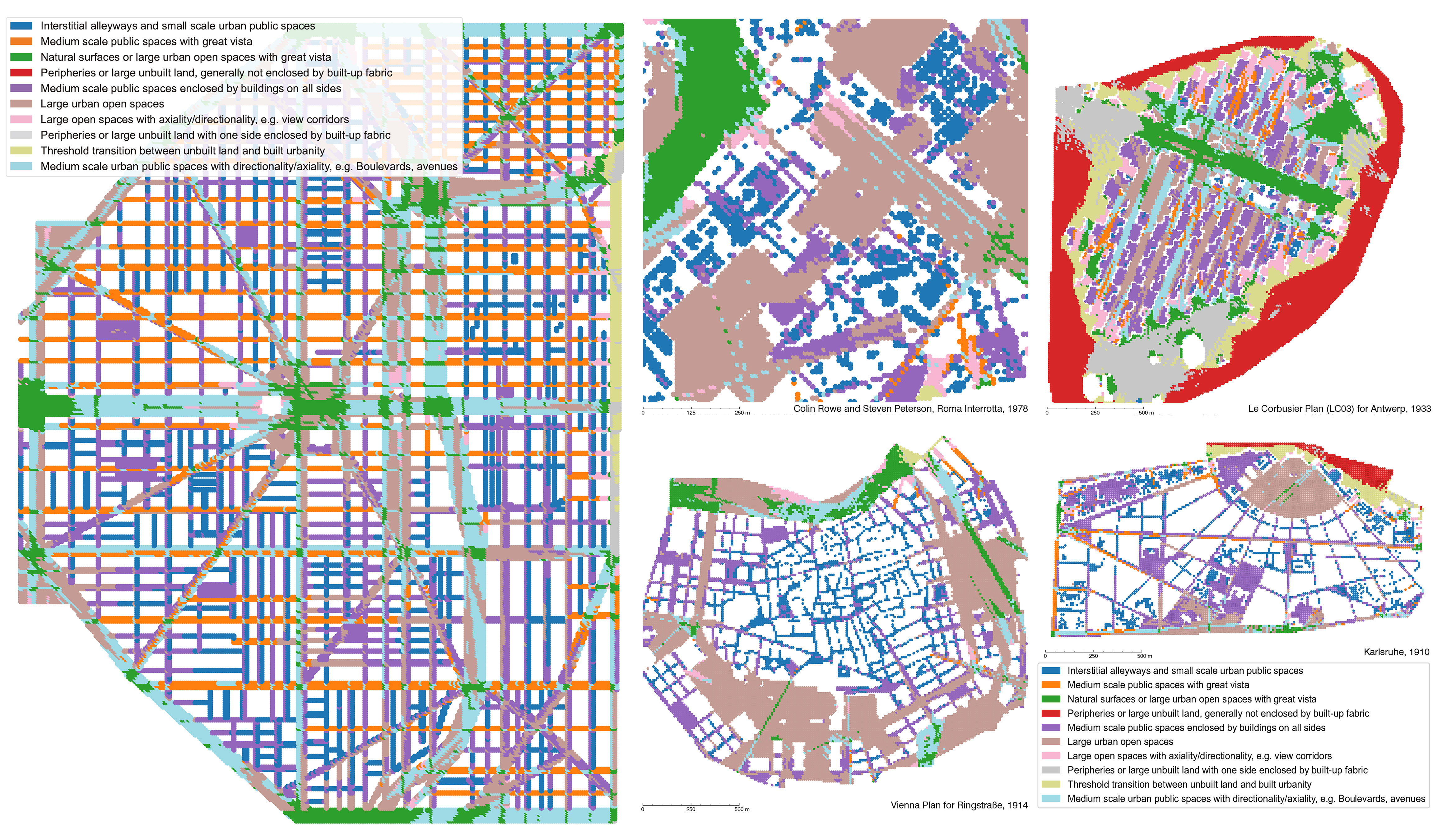 To characterise and to critically reflect the similarities and differences of urban forms and urban spaces across contexts, this report presents an experimental methodology for the classification of urban spaces into types. The particular aspect of analysis which this paper has tested on, and is certainly aiming to transcend, is the assessment of view and visibility in the urban public space. By mapping out the ‘Isovist’ - an analytical tool originally put forward by (Benedikt, 1979), and later adopted by the space syntax group to carry out view analysis in smaller-scale architectural spaces - this methodology seeks to map out ‘isovists’ across the public spaces of an urban condition, and aggregated 10 attributes out of each ‘isovist’ analysed. These 10 attributes are indicative of the angle-specific visibility, vista, etc. of a given location. The aggregation of the 10 attributes of each sample point across various case studies of built and unrealised urban plans, constitutes the ‘analytical dataset’.
