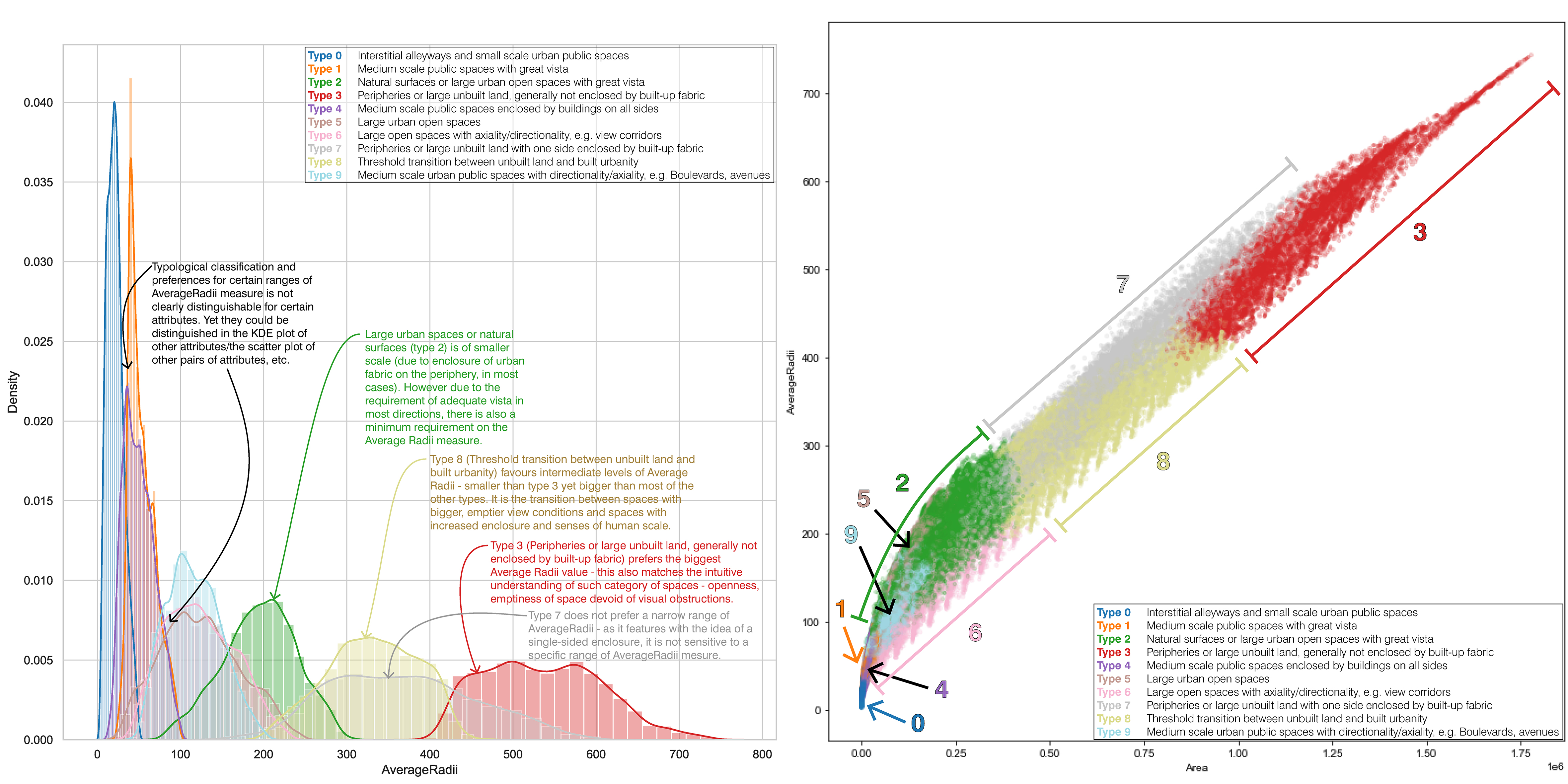 Using advanced data analytics tools such as a Gaussian Mixture Model (GMM), 10 categorical types of urban public spaces are discovered. Contrary to traditional practices of typological research, the determination of each type and the criterion for qualifying for each type is automatically deducted, based on the inherent patterns of data embedded in the ‘analytical dataset’ generated by mapping out ‘isovists’ and their attributes.