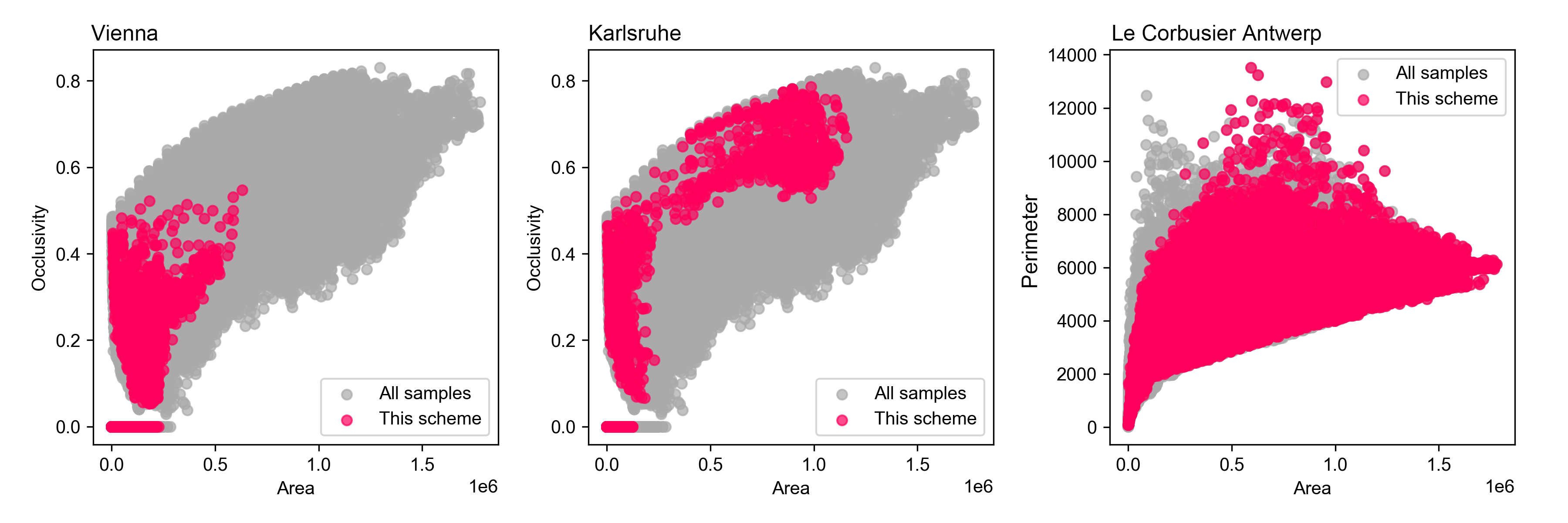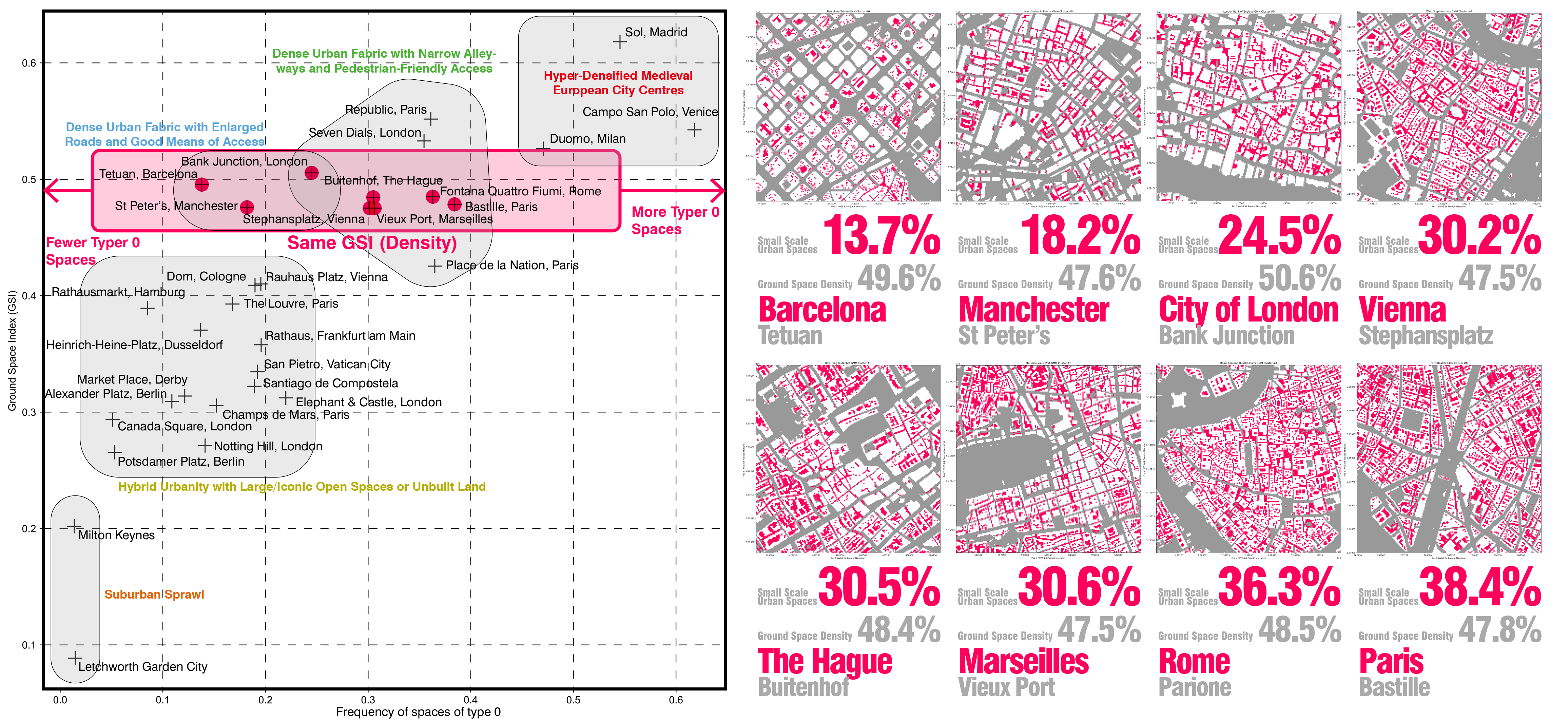 The data-driven categorisation of urban spaces not only produces a reliable, automatic, and fast classification result but also sheds light on many other potentialities. For example, in the discipline of urban analytics, this report presents a workflow to compare the relationship between density and the proportion of interstitial, human-scale alleyways in the urban environment. The result of this analytical tool is also inspiring in the ‘literal’ transformation of the outcome patterns into street furniture and paving since, by definition, the outcome of this analysis is directly indicative of a certain visual quality of the space. In the realm of urban design, an interactive version of this analytical tool is available for instantaneous feedback for designers.