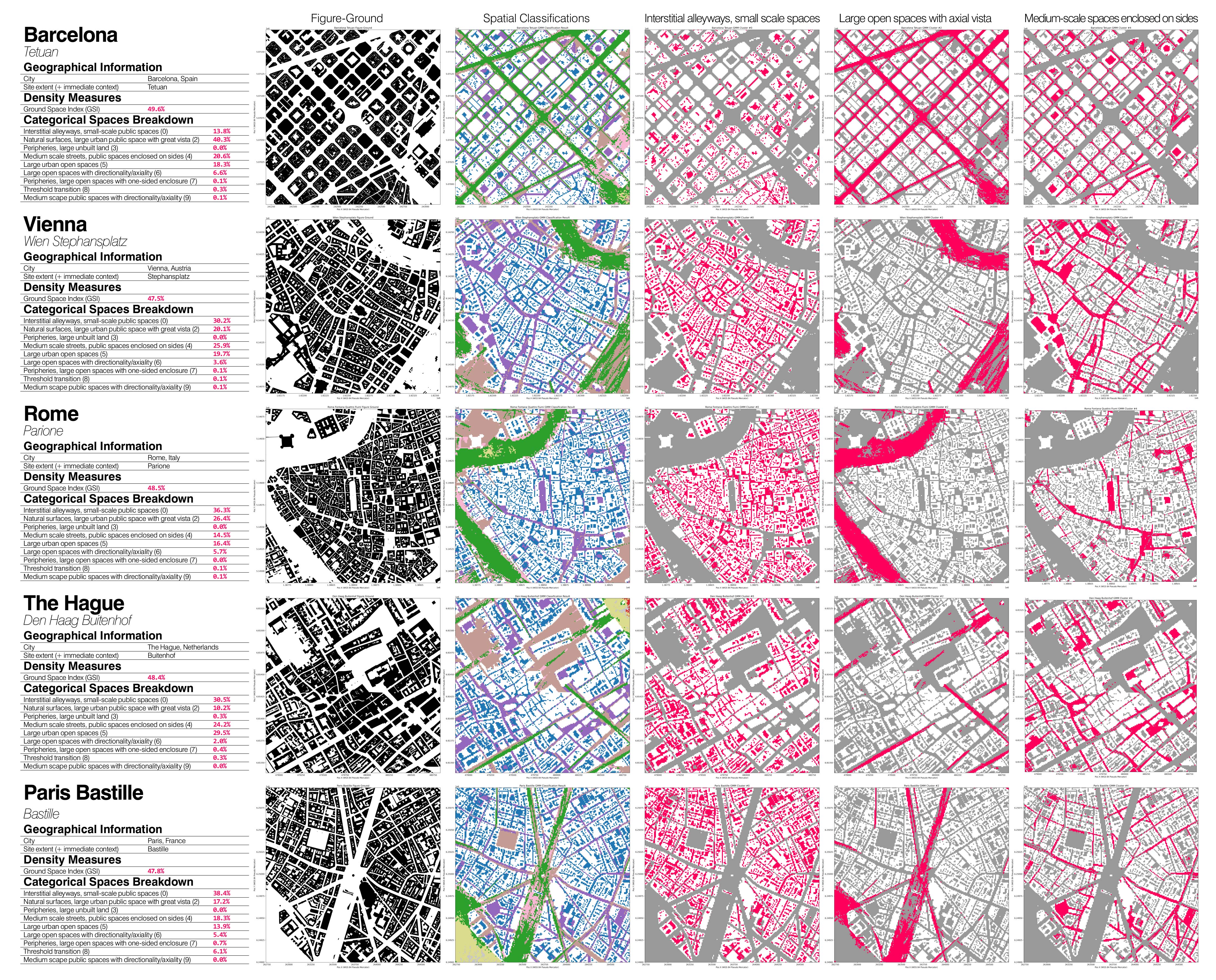 The data-driven categorisation of urban spaces not only produces a reliable, automatic, and fast classification result but also sheds light on many other potentialities. For example, in the discipline of urban analytics, this report presents a workflow to compare the relationship between density and the proportion of interstitial, human-scale alleyways in the urban environment. The result of this analytical tool is also inspiring in the ‘literal’ transformation of the outcome patterns into street furniture and paving since, by definition, the outcome of this analysis is directly indicative of a certain visual quality of the space. In the realm of urban design, an interactive version of this analytical tool is available for instantaneous feedback for designers.