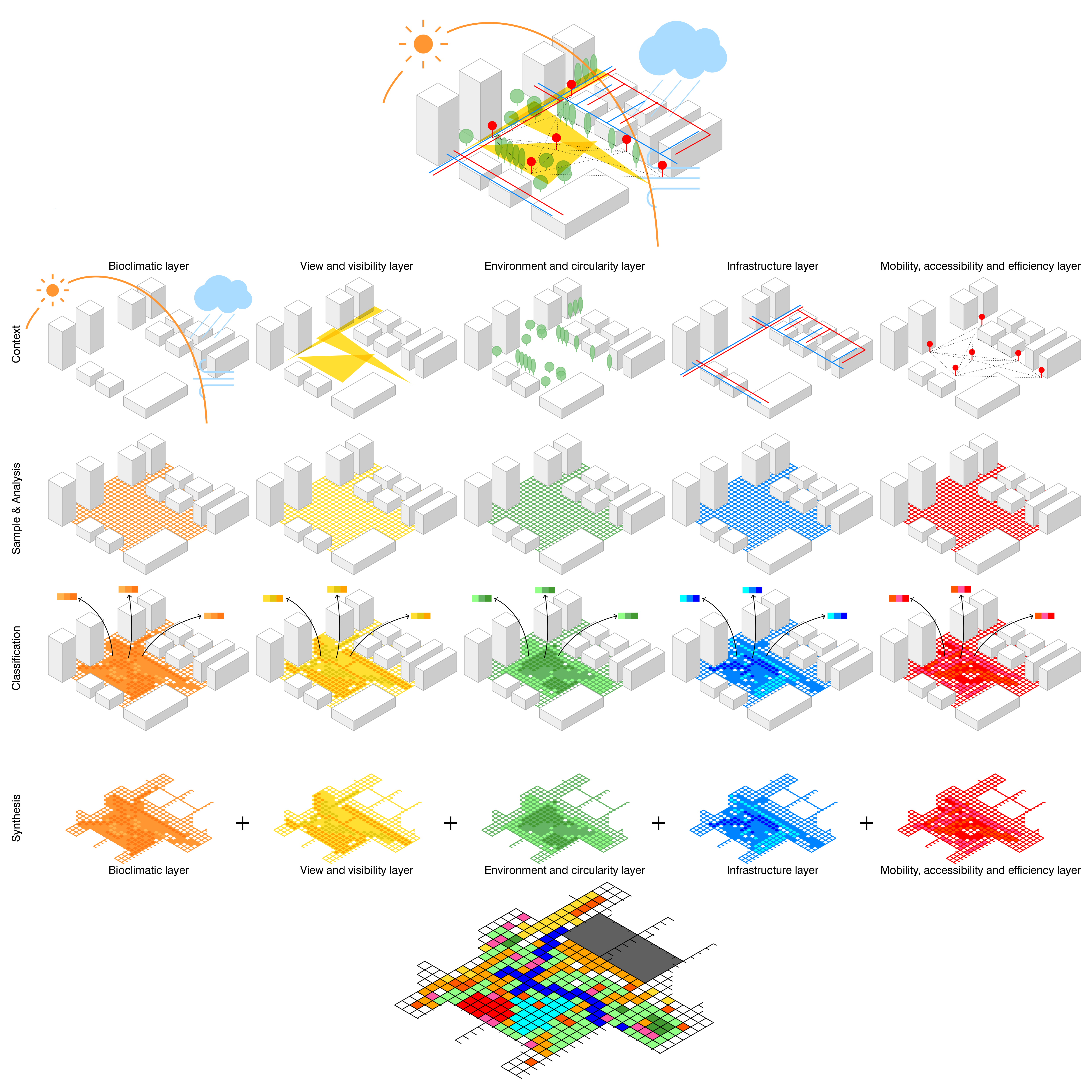 To characterise and to critically reflect the similarities and differences of urban forms and urban spaces across contexts, this report presents an experimental methodology for the classification of urban spaces into types. The particular aspect of analysis which this paper has tested on, and is certainly aiming to transcend, is the assessment of view and visibility in the urban public space. By mapping out the ‘Isovist’ - an analytical tool originally put forward by (Benedikt, 1979), and later adopted by the space syntax group to carry out view analysis in smaller-scale architectural spaces - this methodology seeks to map out ‘isovists’ across the public spaces of an urban condition, and aggregated 10 attributes out of each ‘isovist’ analysed. These 10 attributes are indicative of the angle-specific visibility, vista, etc. of a given location. The aggregation of the 10 attributes of each sample point across various case studies of built and unrealised urban plans, constitutes the ‘analytical dataset’.