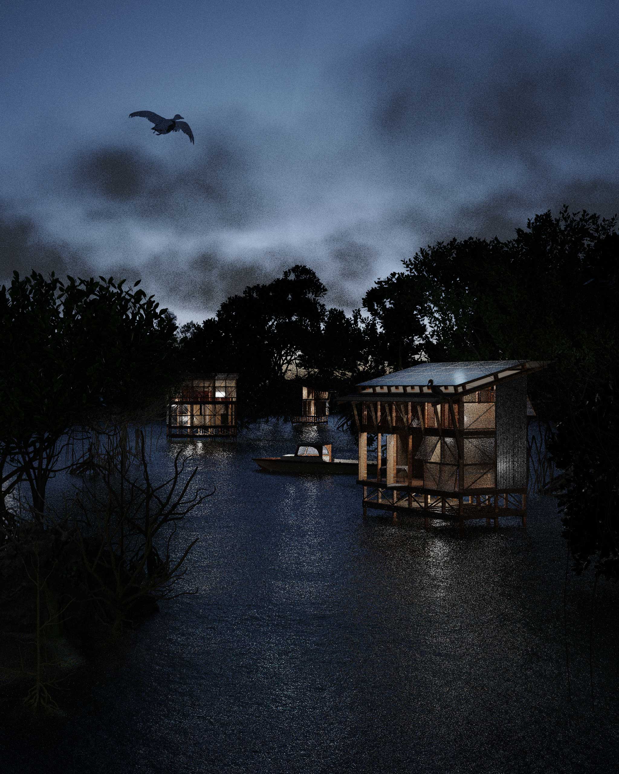 This design operates in the scope of mangrove forests in Sundarbans, Bangladesh and India. It proposes an infrastructural device for living and well-being in mangrove forests, and provides shelter for various types of groups and families, including local forestry workers, tourists, and underprivileged personnel with a demand of place of retreat during conditions of emergency. This scheme delivers a housing prototype of 441 sqft that contains only the essential equipment of living, yet it could be easily be reconfigured, expanded, extended and multiplied in the case of need.